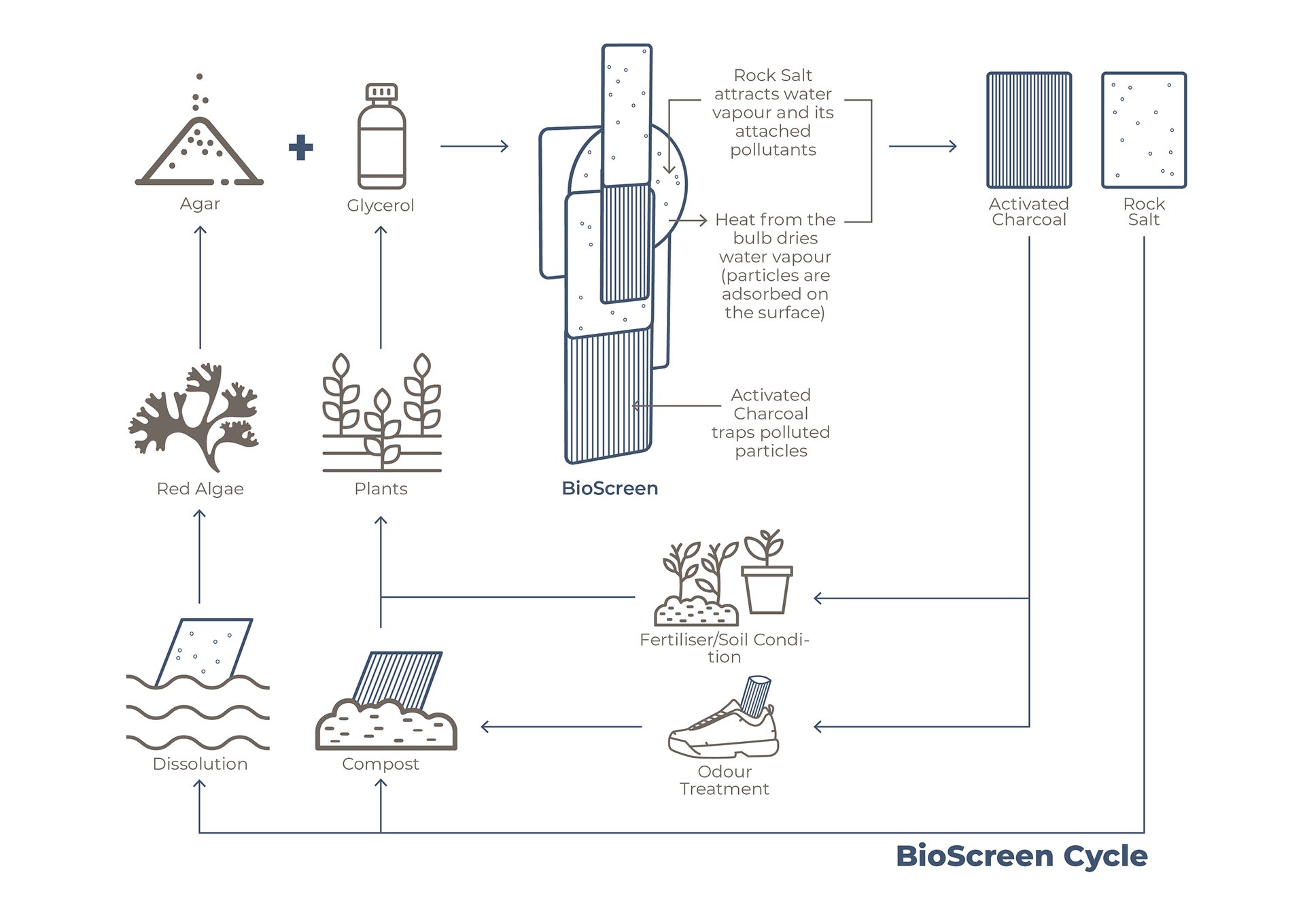 BioScreen is a home product that is both good for people and planet for the future of sustainable living. The integration between lamp and partition for space dividing simultaneously transforms and illuminates the area in which it is placed. With the circular economy principles, design for biodegradability; recyclability; produce more locally and without toxicity. A two-ingredient bioplastic sheet made out of agar and glycerol is 100% biodegradable and edible. Agar is a substance obtained from red algae, glycerol derived from plant sources; they are locally and globally abundant and renewable. By combining natural substances like salt and activated charcoal within the bioplastic sheet, BioScreen could potentially help improve health and wellbeing of the user.